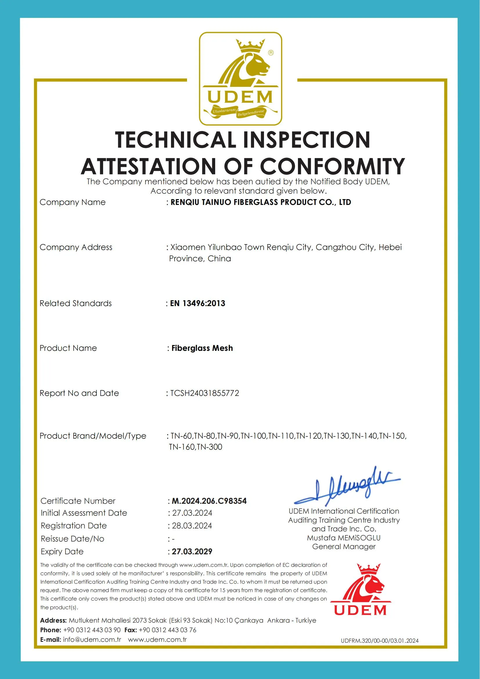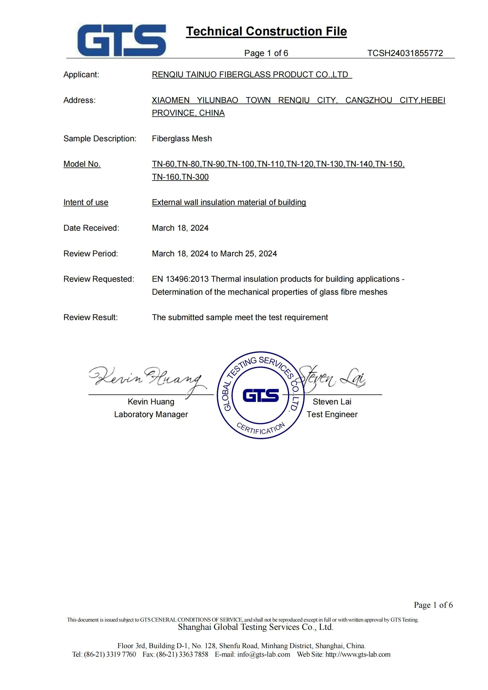 Tainuo Fiberglass Mesh Factory established in 2000 , located in Renqiu City, Hebei Province with convenient transportation access. The company is an integrated enterprise integrating research ,production ,development and sales . It covers an area of 20000 square meters and has 4 sets of fiberglass yarn production lines . In2005 , the company invested in the production of fiberglass products and built a 1,0000 square meters weaving workshop ,equipped with a set of advanced fiberglass mesh production lines , with an annual output of 60 million square meters . Our company has strong technical team. In the process of continuous development.Our factory has grown to be one of the largest fiberglass mesh production bases in the North of China.